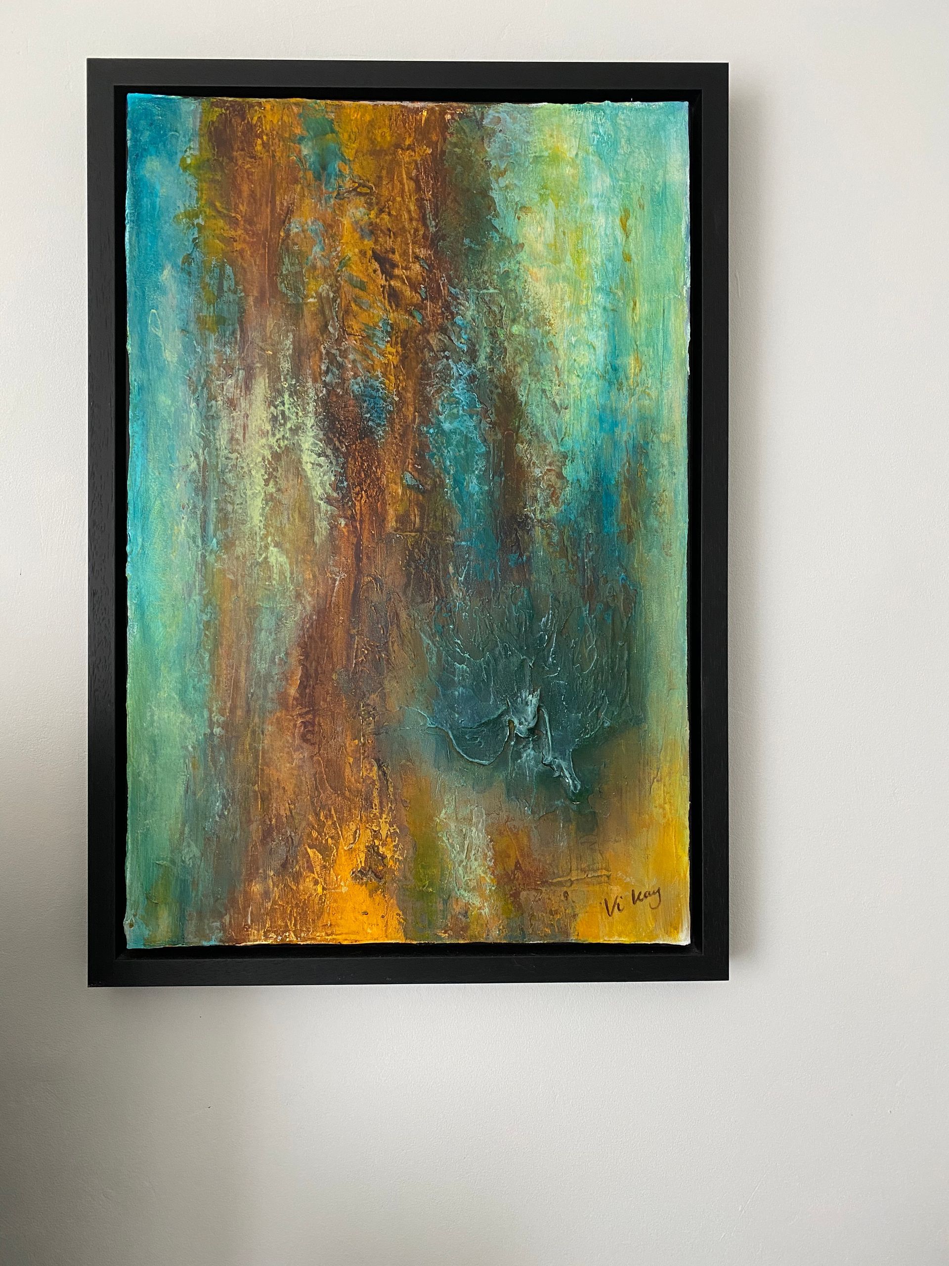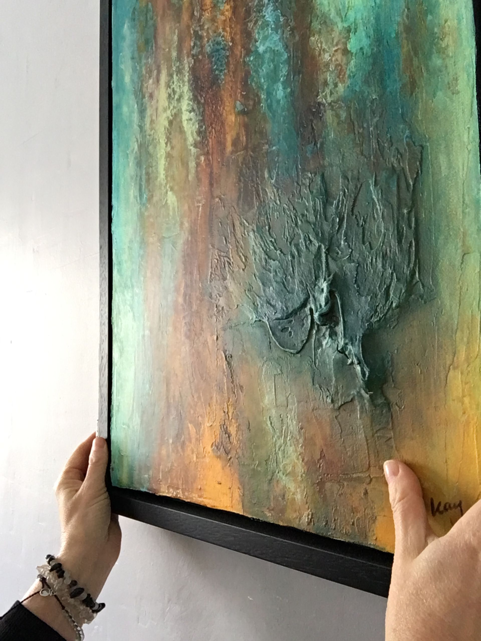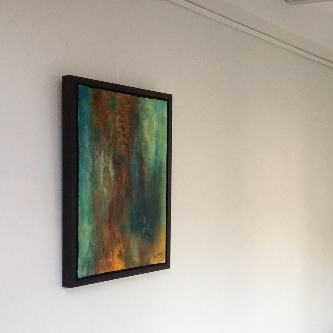 This painting was born out of my fascination with rust. The colors and textures transform what once was into something even more beautiful. I created an eye-catching element where the structure resembles melting iron running down the canvas. This symbolizes the birth of iron, shaped in its liquid form. Once it reaches its final shape, the forces of nature take over, transforming it over time into amazing colors. I love that about rust—it just gets more beautiful and more interesting as it stands the test of time.