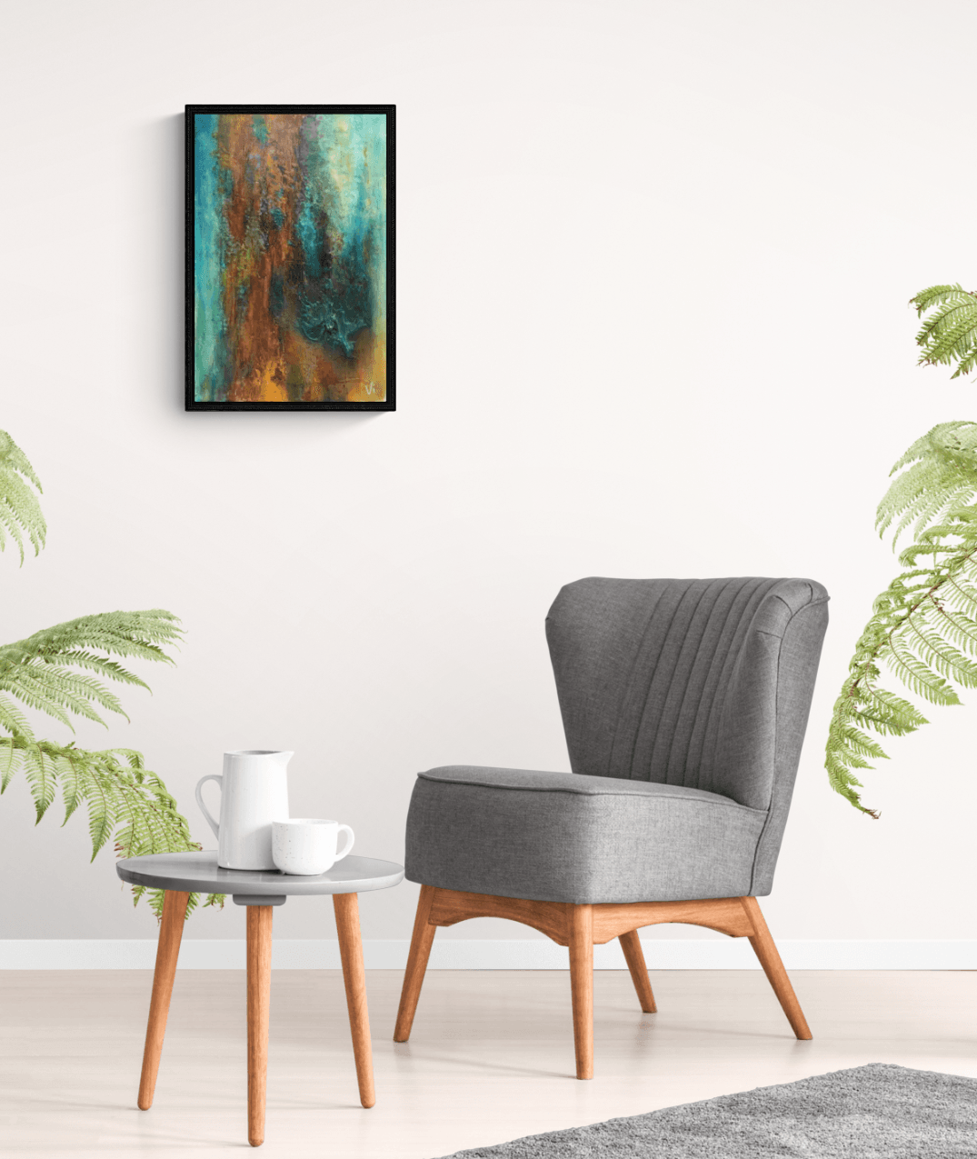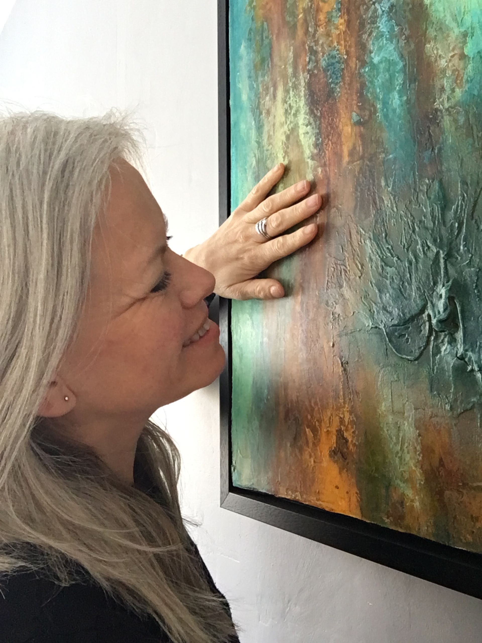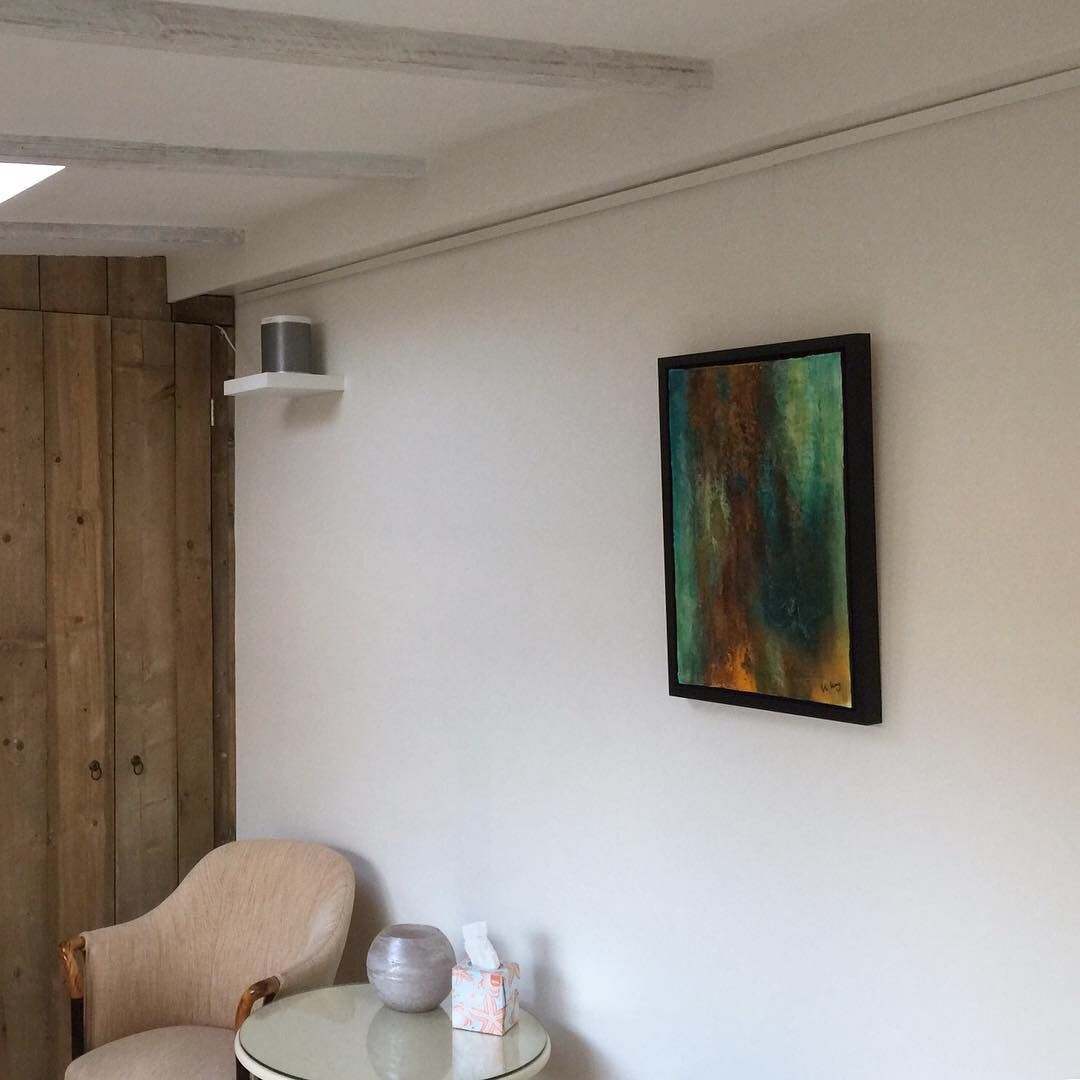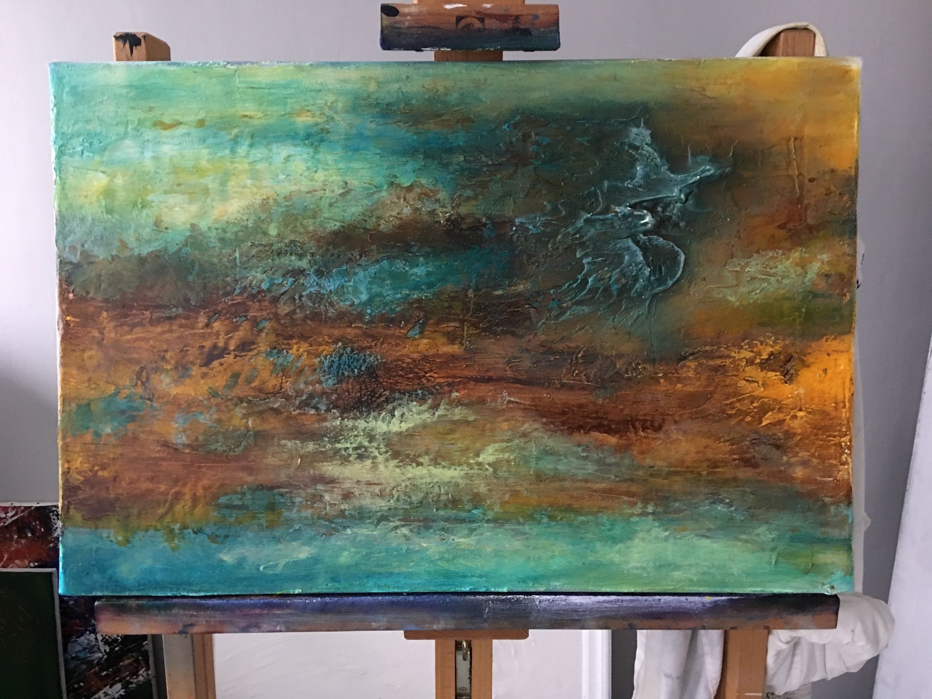 This painting was born out of my fascination with rust. The colors and textures transform what once was into something even more beautiful. I created an eye-catching element where the structure resembles melting iron running down the canvas. This symbolizes the birth of iron, shaped in its liquid form. Once it reaches its final shape, the forces of nature take over, transforming it over time into amazing colors. I love that about rust—it just gets more beautiful and more interesting as it stands the test of time.